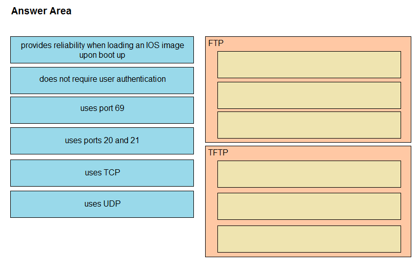 - FTP: Uses ports 20 and 21 over TCP by default and is more reliable for loading IOS images.