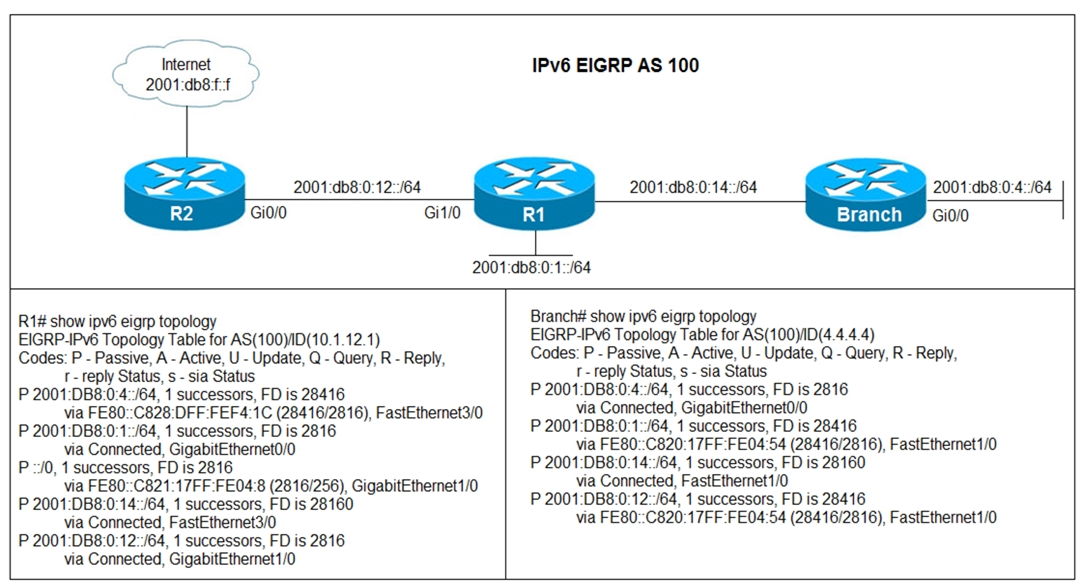 - Option C (Issue the eigrp stub command on R2): R2 is already advertising a default route. Making R2 a stub router would prevent R2 from receiving routes from R1, potentially breaking connectivity, but it would not address the stated issue where users in the branch network cannot reach the internet.