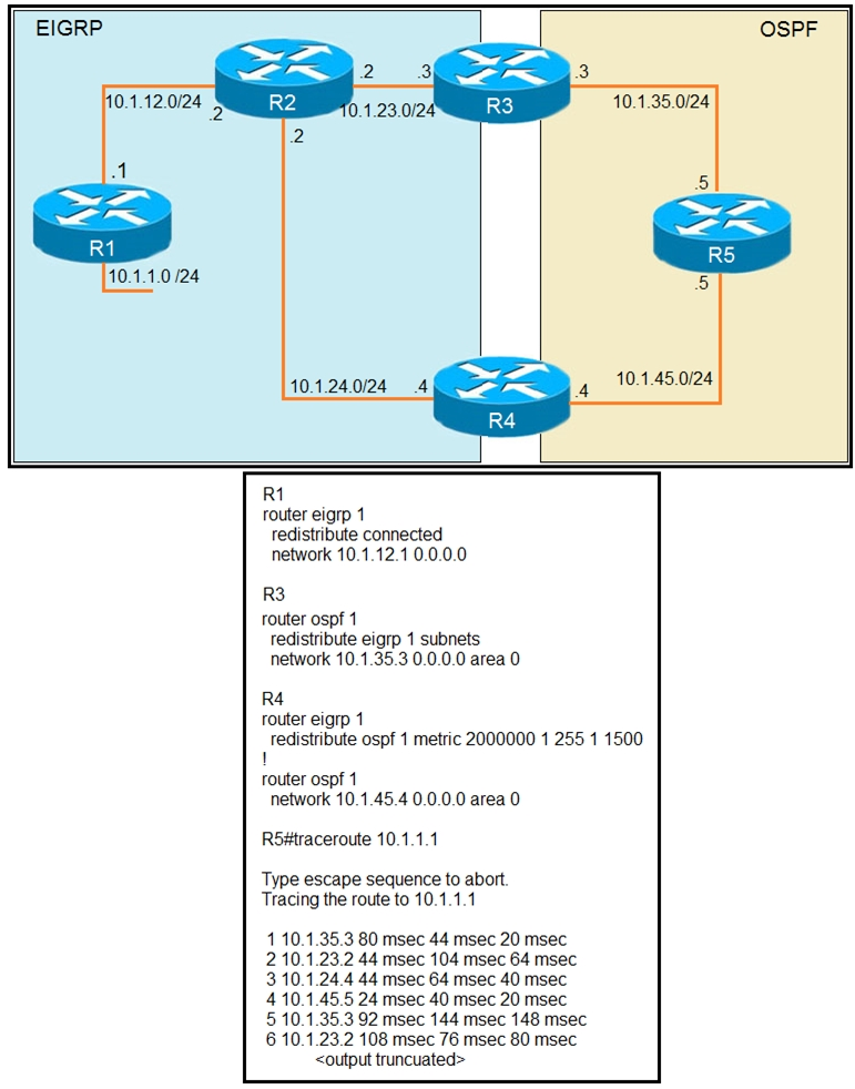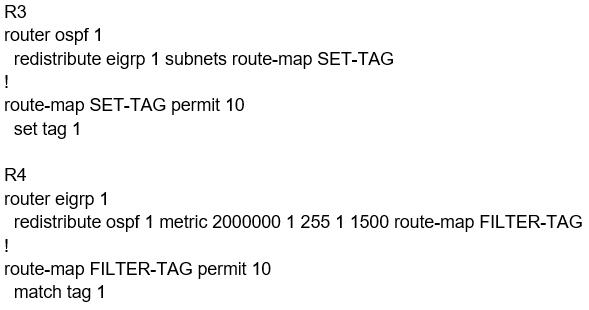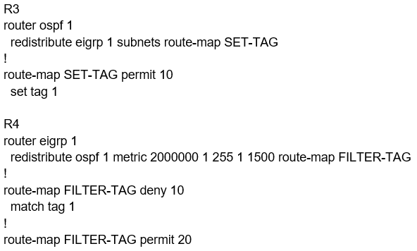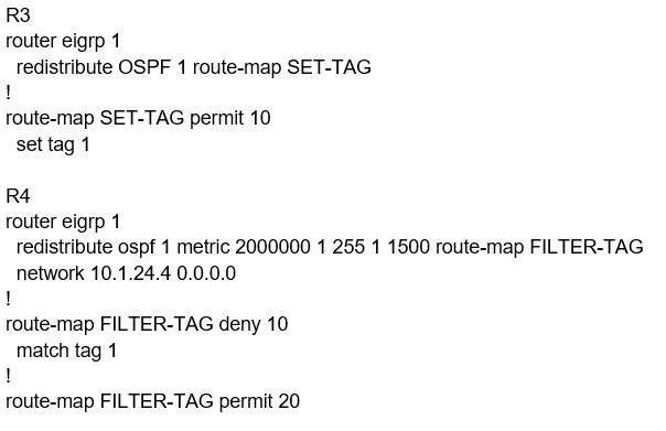 - Option B: While it attempts to tag and filter, the subnet 10.1.1.0/24, which is the apparent source of the loop based on the traceroute, is not tagged on the EIGRP to OSPF redistribution at R3. Therefore, R4 cannot effectively block it. Furthermore, redistribution into EIGRP requires specifying metrics (K values), which are absent in option B's configuration.