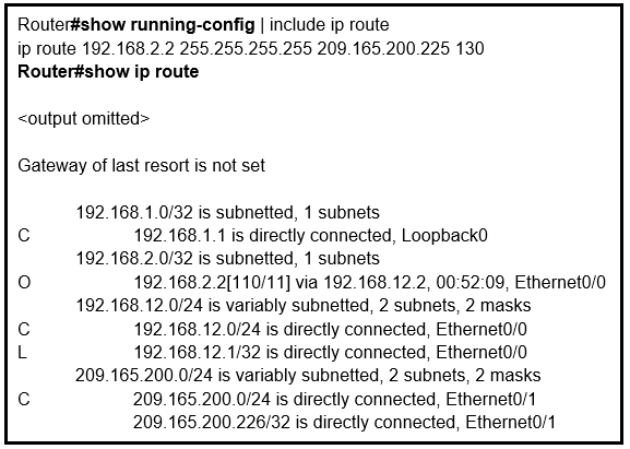 - D. The syntax of the static route is not valid, so the route is not considered. If the syntax were invalid, the route wouldn't be in the routing table at all. The exhibit shows the route is present, just not being used.