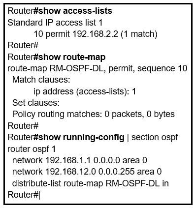 - D. Add this statement to the route map: route-map RM-OSPF-DL deny 20. This is not the correct answer. Adding another deny statement with a different sequence number (20) would be processed *after* the permit statement (10). Thus, the route would still be permitted by the first statement. Sequence numbers are processed in ascending order. The existing permit statement must be changed to a deny statement to block the route.