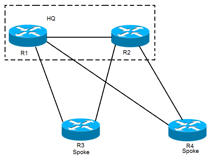 - B: R1 load-balances across the paths through R3 and R4 to reach R2 - This is incorrect because R2 is configured as a stub router. R1 will not have routes to R2 via R3 or R4 after the direct link fails.
