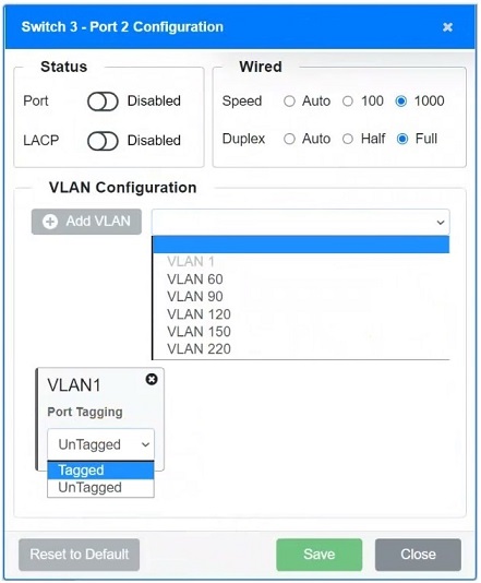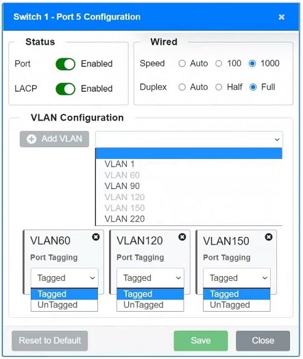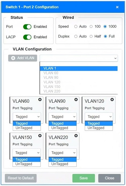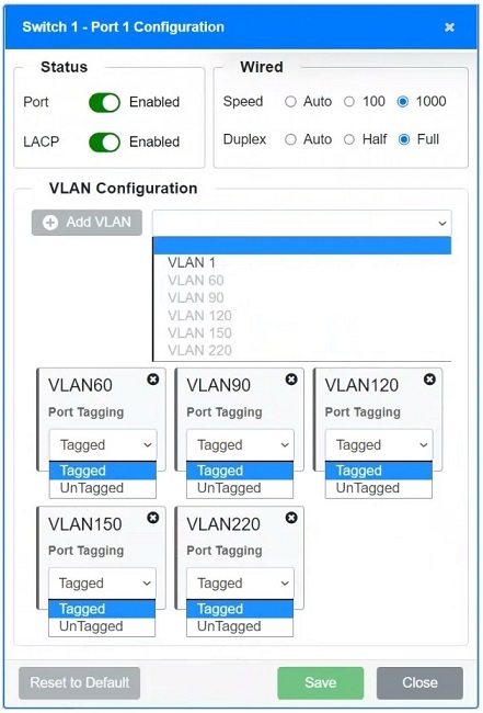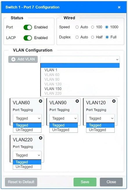 - Ports should have VLANs set according to the devices they connect to. For instance, if a port is connecting to servers, only the VLAN for servers (e.g., VLAN 90) should be enabled and tagged if required.