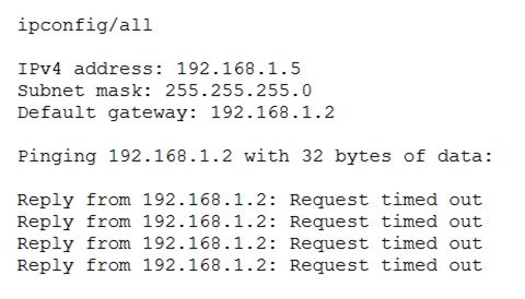 After configuring IP networking on a newly commissioned server, a server administrator installs a straight-through network cable from the patch panel to the switch. The administrator then returns to the server to test network connectivity using the ping command. The partial output of the ping and ipconfig commands are displayed below: