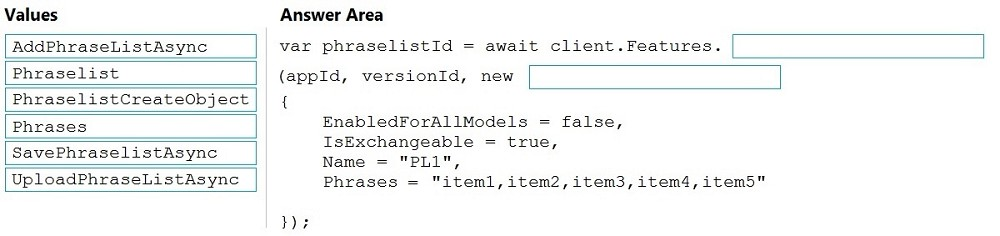 - Other options are either not relevant to the task of adding phrases programmatically or are not valid objects/methods within the LUIS SDK for this purpose. Specifically, without knowing the other options displayed in the drag-and-drop interface of the actual exam, it's impossible to address these in detail, but the provided information makes it clear that the only logical choice given the stated intent is