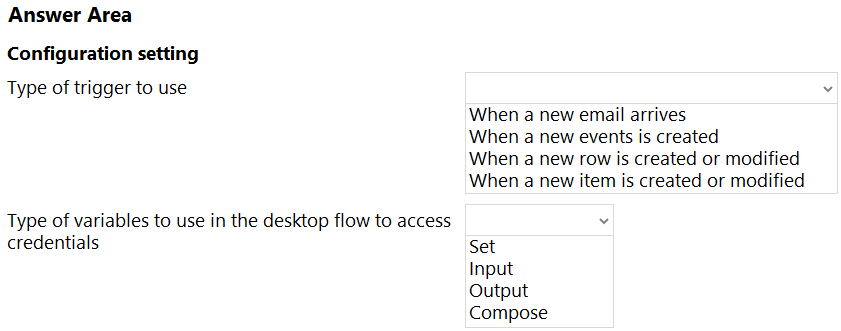 Each day the company receives an email that contains an attachment. The attachment lists orders from the company’s rail transportation partners. You must create an automation solution that reads the contents of the email and writes records to the ERP system. The solution must pass credential from a cloud flow to a desktop flow.