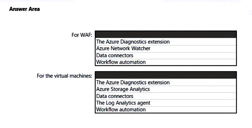 Reasoning for Box 2 (Azure Monitor Agent): While the Log Analytics agent has historically been used, the Azure Monitor Agent is the recommended, updated solution for collecting data from virtual machines and integrating with services like Microsoft Defender for Cloud. The Azure Monitor Agent offers several advantages, including better performance, centralized management, and enhanced security. While the Log Analytics Agent would technically fulfill the requirement, choosing the Azure Monitor Agent aligns with current best practices and the future direction of Azure monitoring. This also aligns with the discussion content that the Log Analytics Agent is being deprecated and Azure Monitor Agent is a suggested alternative.