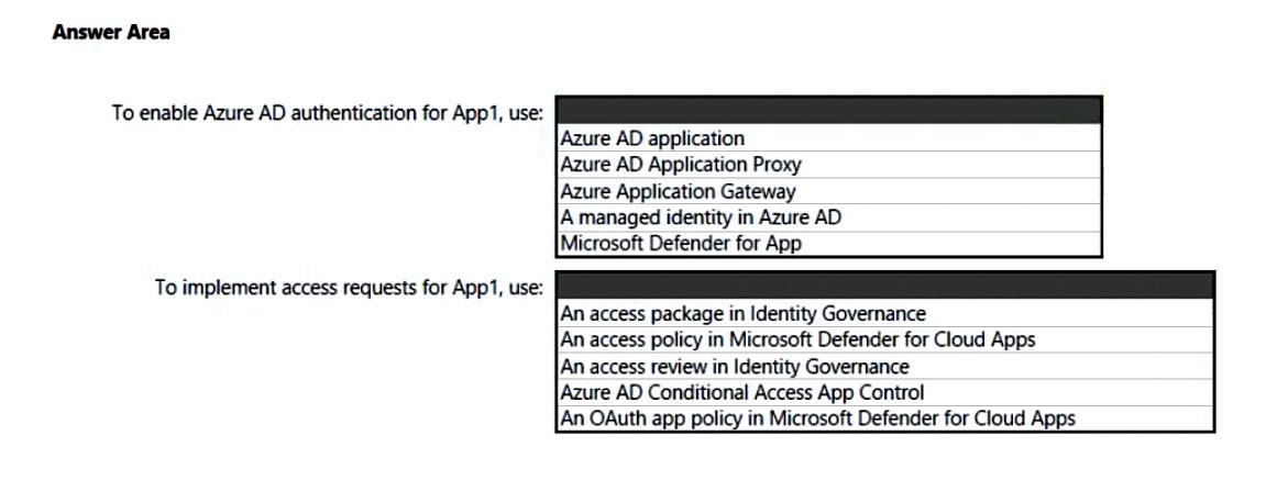 Why other options are less suitable: While other Azure AD features might play a role in securing App1, they don't directly address the need for self-service access requests in the same way that access packages do. Other configurations are depend on the specific network architecture and policy enforcements that may not directly relates to this question.