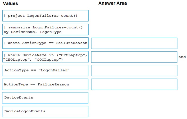 You need to create an advanced hunting query to count failed sign-in authentications on three devices named CFOLaptop, CEOLaptop, and COOLaptop.
