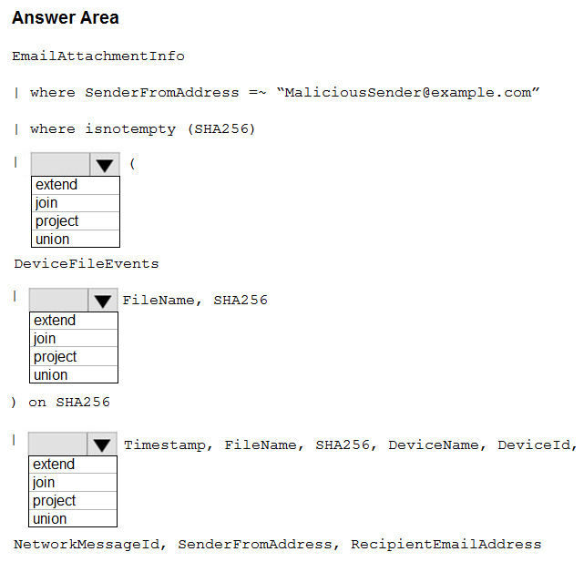 The recommended answer is to use Join, Extend, and Project in that order. This is because the initial query focusing on email events does not directly include device-specific information like DeviceName and DeviceId, which are essential for identifying affected devices. Therefore, we need to first Join the tables using a common key such as NetworkMessageId, then Extend the table to incorporate device information, and finally Project the desired fields for the final output.