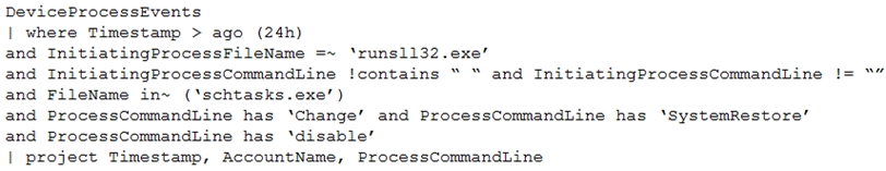 You need to receive an alert when any process disables System Restore on a device managed by Microsoft Defender during the last 24 hours.