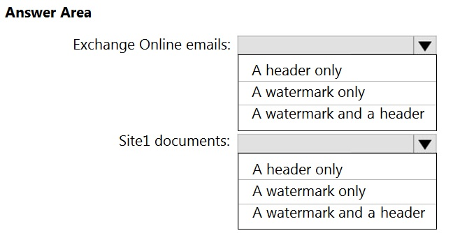 Reasoning: Sensitivity labels with watermarks can be applied to documents in SharePoint Online (Site1). Sensitivity labels with headers can be applied to both emails in Exchange Online and documents in SharePoint Online. However, watermarks cannot be directly applied to emails.