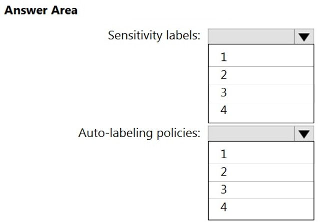 What is the minimum number of sensitivity labels and auto-labeling policies you should create? To answer, select the appropriate options in the answer area.