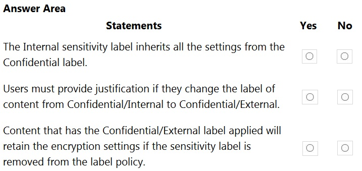 Statement 1: Applying the Confidential\Internal sensitivity label to a file that has the Confidential\External sensitivity label automatically removes the encryption from the file.