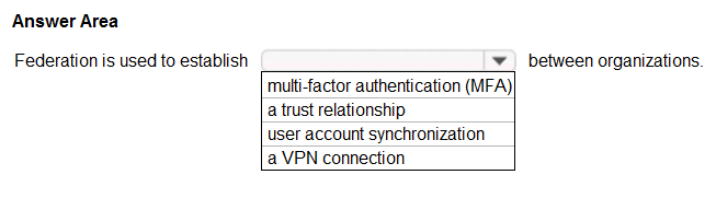Why not other answers: While the image suggests possible answers like Synchronization, and Single sign-on, those are results after the trust relationship. The question is asking about what is used to "establish" between organizations, not the results after the establishment.