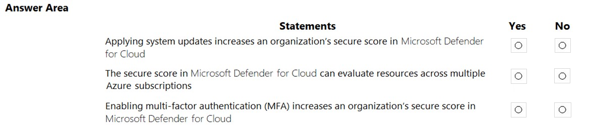 In summary, regularly applying system updates, utilizing Microsoft Defender for Cloud to assess resources across multiple subscriptions, and implementing MFA are all essential security measures that positively impact the secure score. Therefore, "Yes" for all three statements is the correct answer.